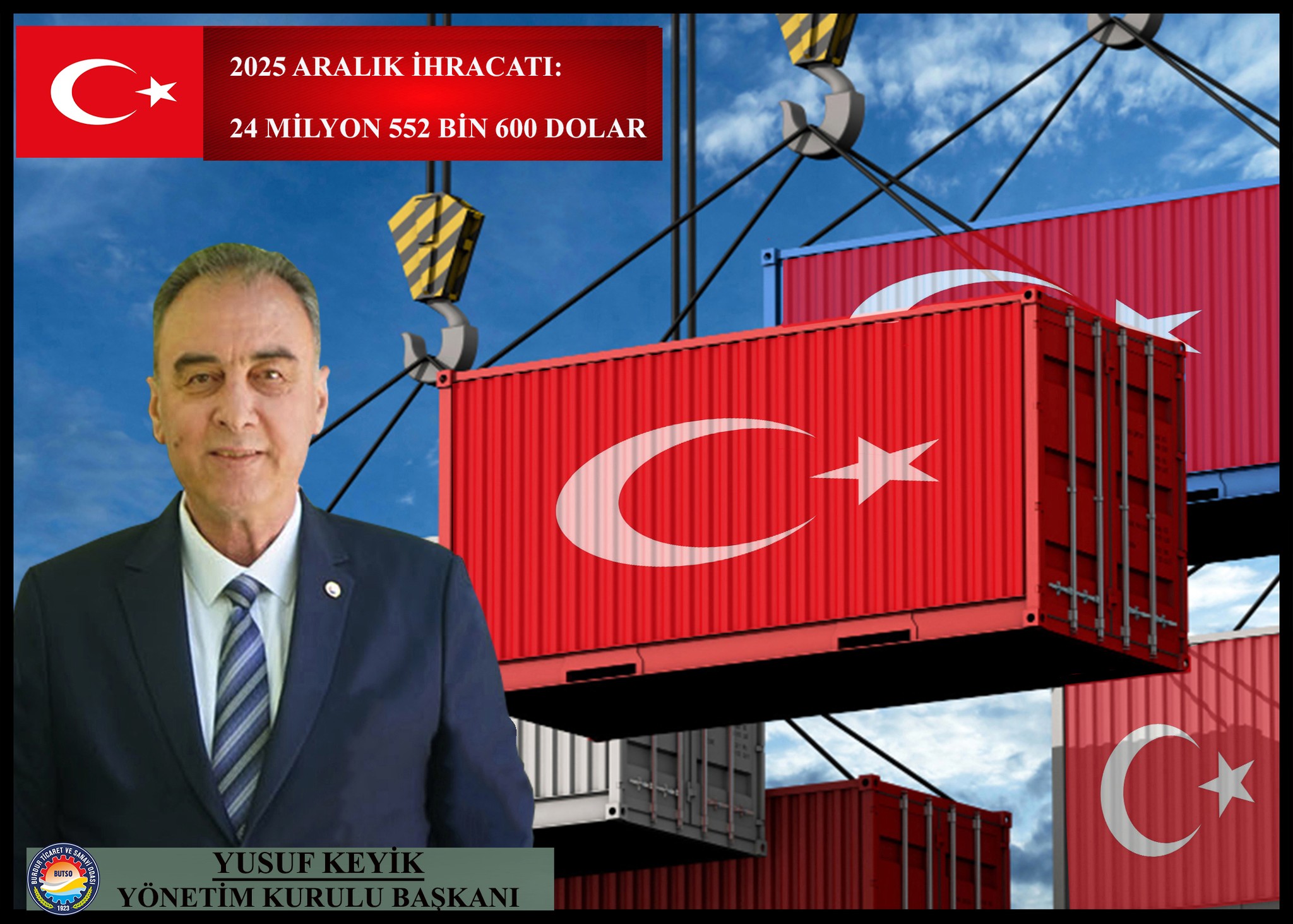Burdur Ticaret ve Sanayi Odası (BUTSO) Yönetim Kurulu Başkanı Yusuf Keyik: “Aralık ayında ilimizin ihracat hacmi bir önceki yılın aynı ayına göre yüzde 26,2’lik artışla 24 milyon 552 bin 600 dolardır. Serbest Bölgeler hariç 46 ülkeye ihracat yaptık.